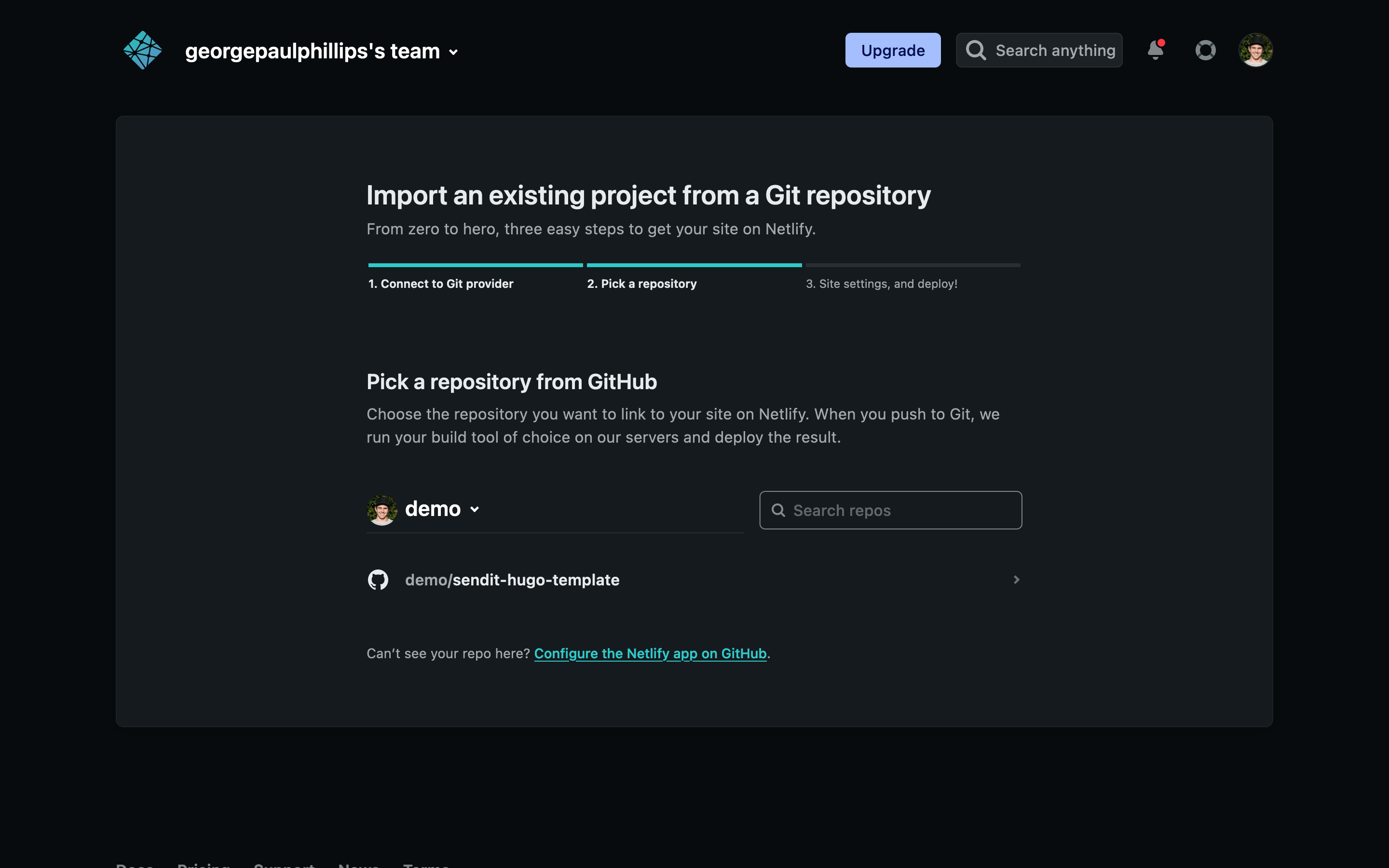CloudCannon works with SSG-based content. Any builder available on Netlify is available on CloudCannon. The first step is to select your Git repository.